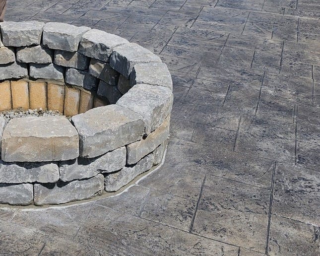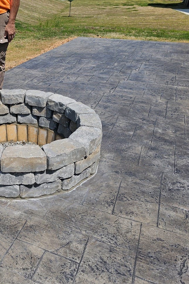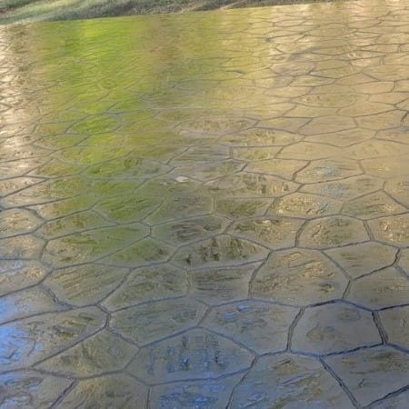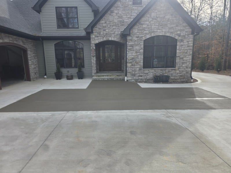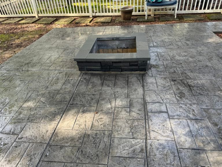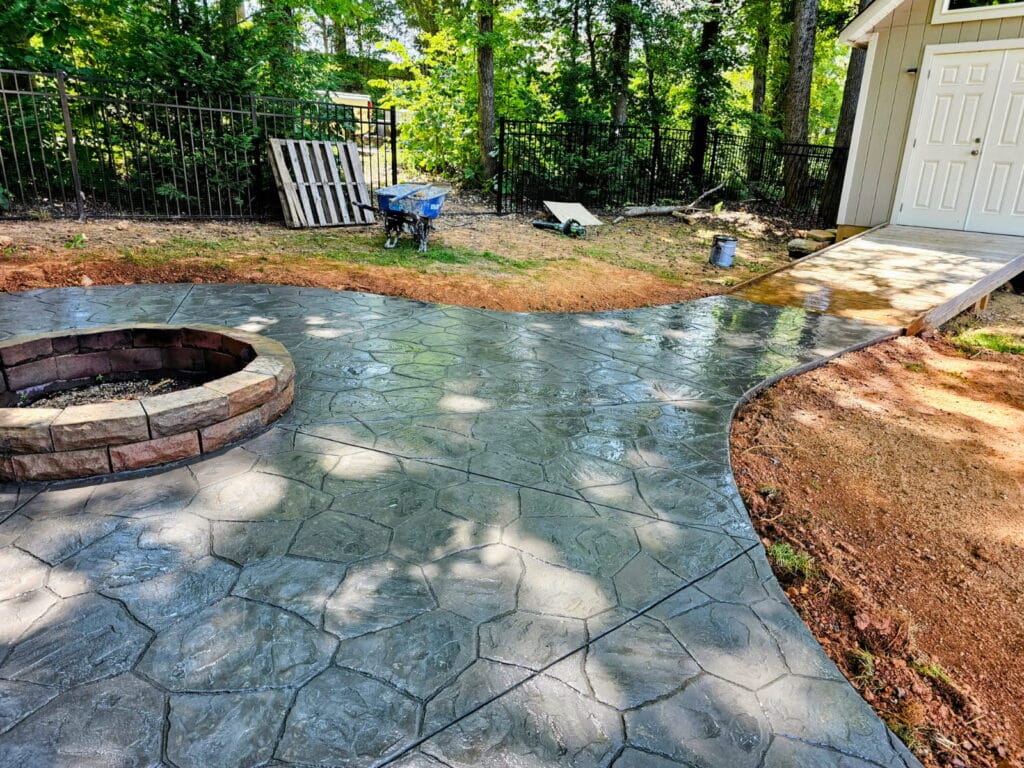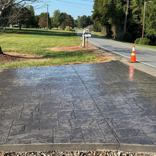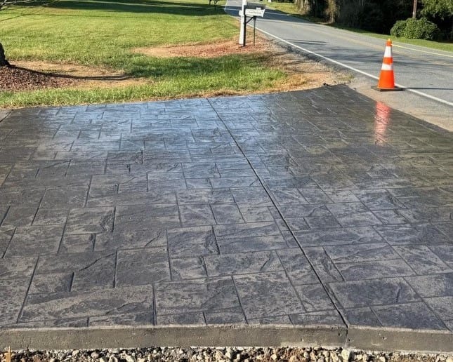 Incredible stamped concrete driveway installation featuring a classic ashlar slate pattern in rich charcoal tones. This decorative finish delivers the sophisticated look of natural stone at a fraction of the cost. Expert stamping and coloring techniques create realistic texture and dimension, while the durable concrete base ensures long-lasting performance. A perfect upgrade that dramatically enhances curb appeal.