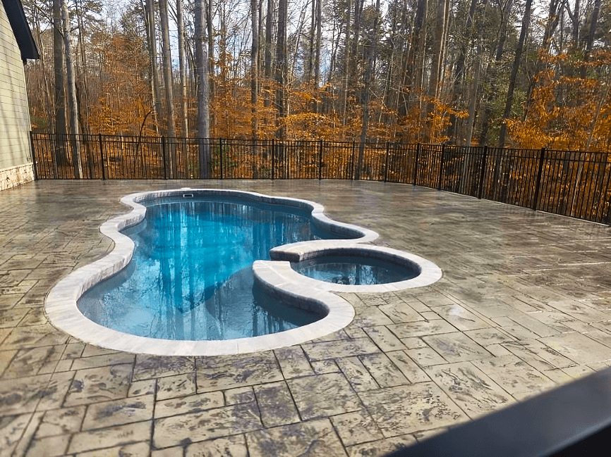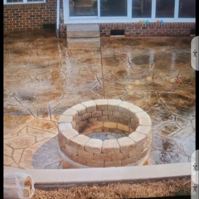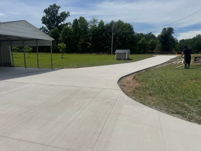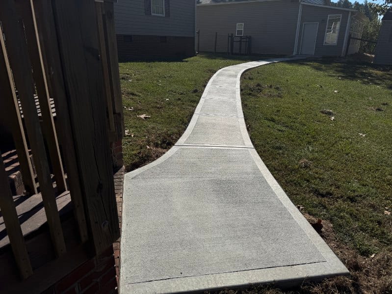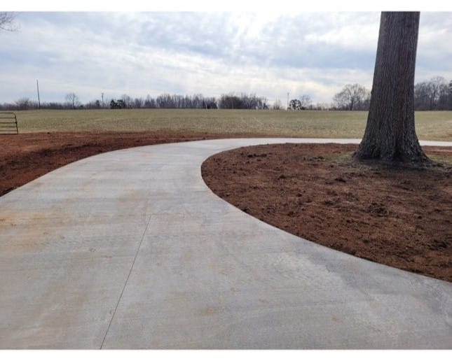 A stunning custom-designed concrete patio featuring a flowing, curved walkway that opens into a spacious circular seating area. This unique design creates the perfect outdoor entertainment space with smooth, professional finishing throughout. Expertly poured and finished to complement the natural landscape while providing a durable, low-maintenance surface for years of enjoyment.
